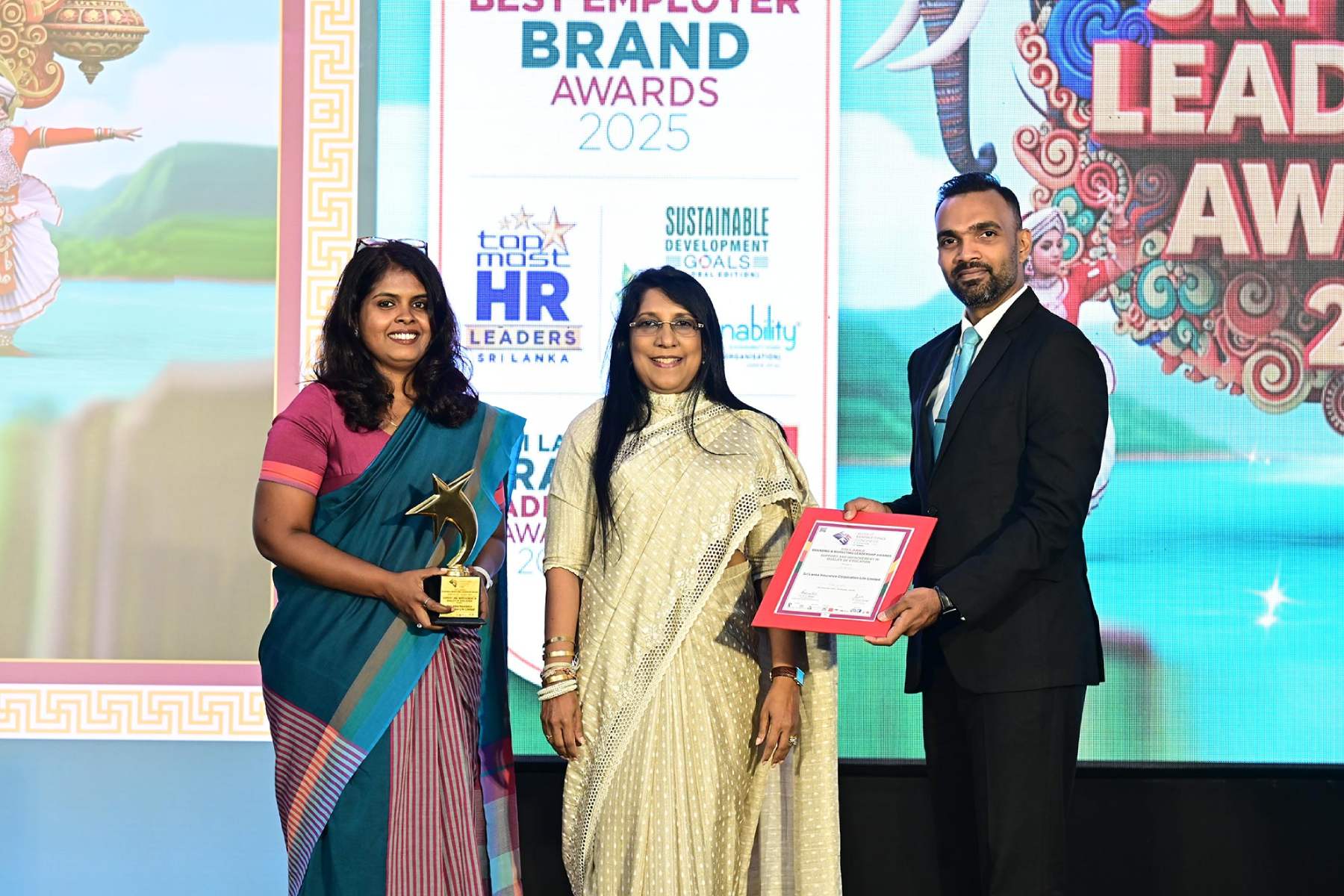 Amali Gomez, Manager Corporate and Marketing Communications (Left) and Ruchira Edirisinghe, Brand Manager (Right) of SLIC Life receiving the award from Ms. Indika Demuni de Silva PC, (middle) for ‘Excellence in CSR’